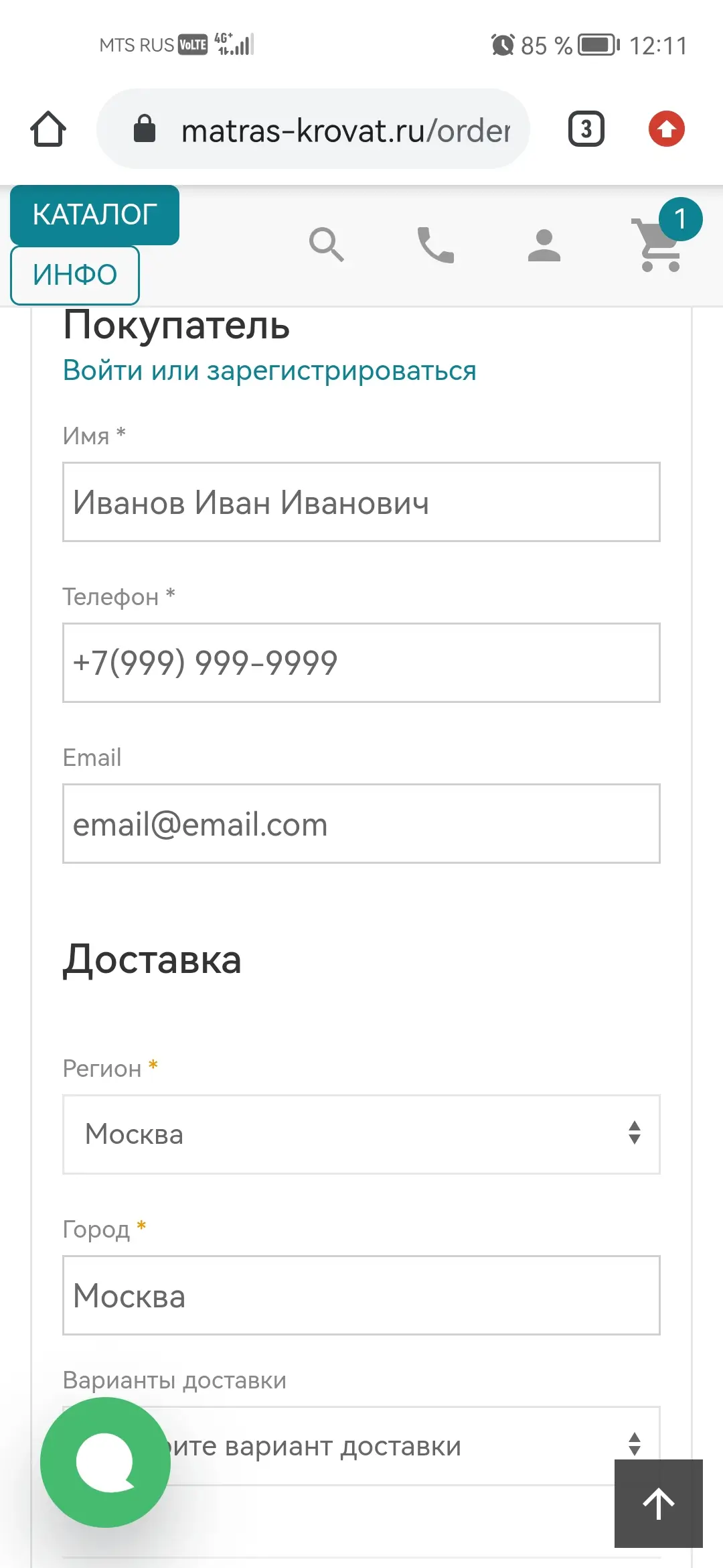 4. Выберите регион и город, куда нужна доставка заказанного товара и выберите нужный вариант доставки. В случае доставки курьером, укажите полный адрес доставки.