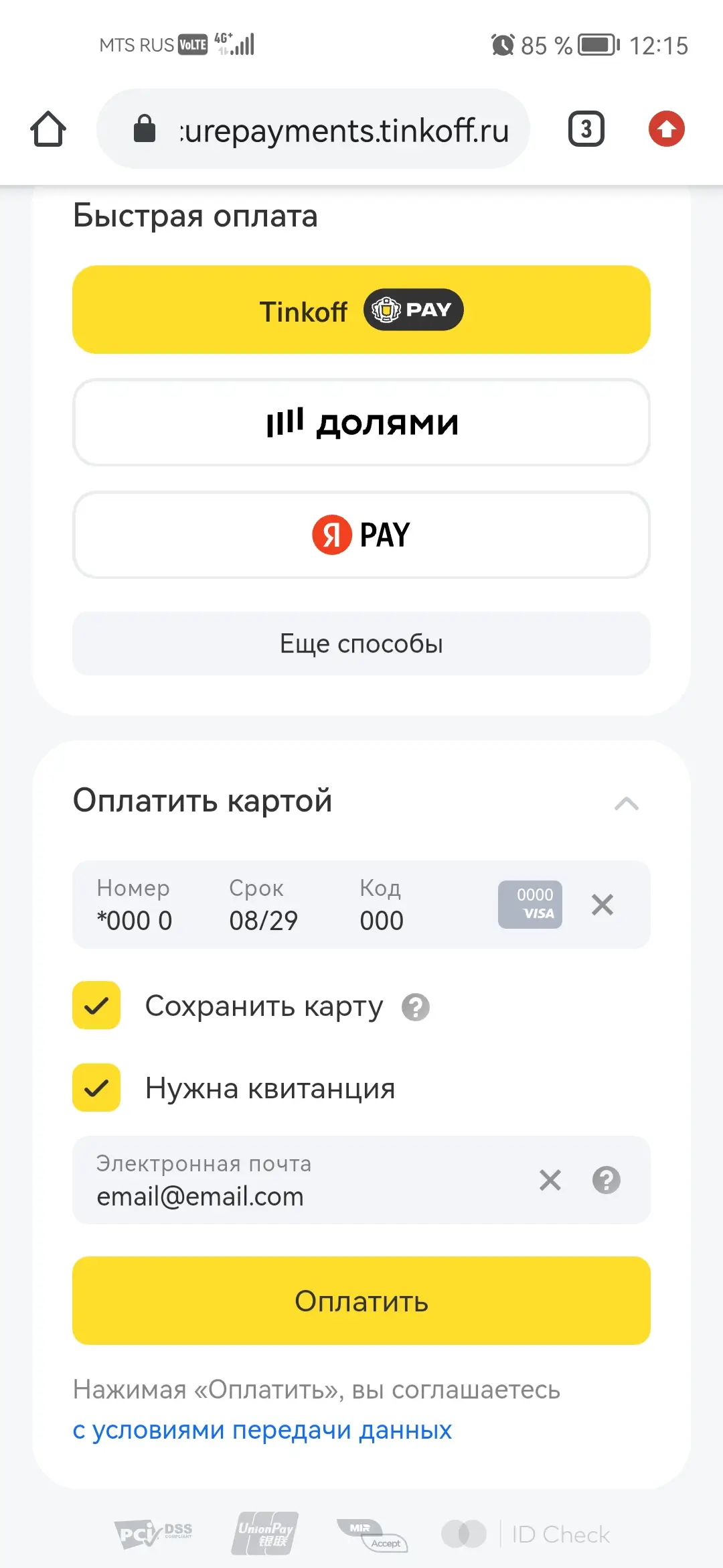 6. После Вы будете перенаправлены на сайт "Тинькофф" для совершения оплаты. На открывшейся странице введите все необходимые данные для оплаты и нажмите "Оплатить".