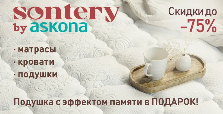 Sontery by Askona — это инновационный бренд матрасов и аксессуаров для сна, созданный ведущим российским производителем ООО "Аскона-век", входящим в состав ТД "АСКОНА".